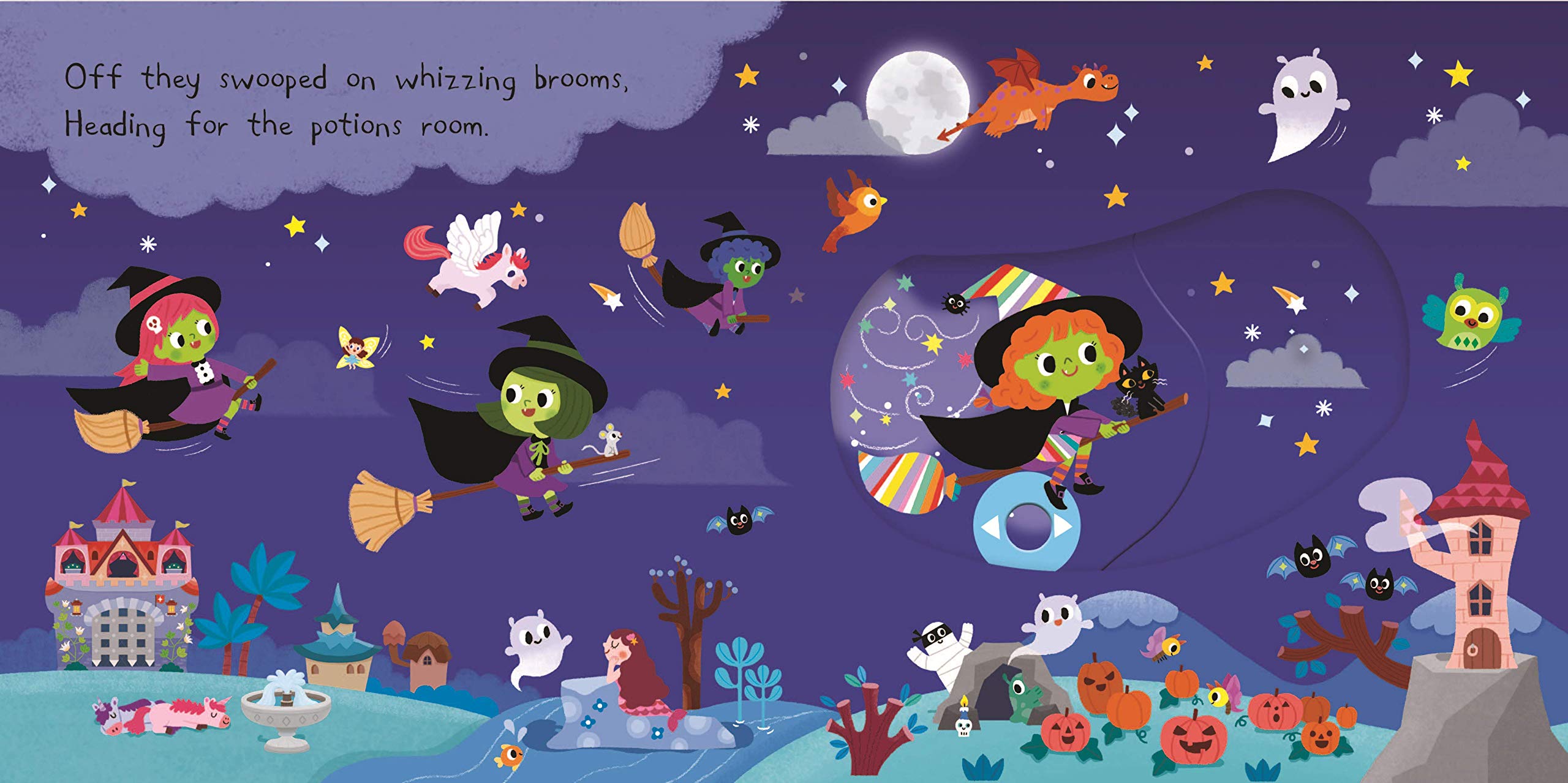 With push, pull and turn mechanisms, little ones will have lots of fun taking part in the witch's spooky adventure!