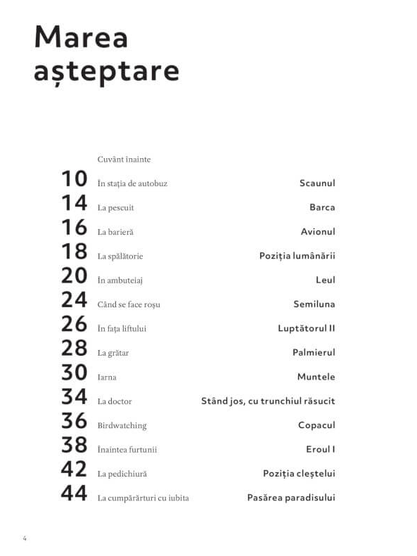 Așteptarea este o binefacere. Bucurați-vă când sunteți blocați în trafic sau când v-a pus cineva „în așteptare”. Fiți recunoscători atunci când sala de așteptare este plină, fiți fericiți când ați ratat avionul, mulțumiți cui v-a făcut să așteptați la o întâlnire. De ce? Pentru că de acum înainte veți avea timp să vă întăriți mușchii, ținuta și flexibilitatea. Nu aveți nevoie de sală sau de saltea și nici de colanți pentru a practica yoga. Aveți nevoie doar de o zi obișnuită, ca toate celelalte și de ceva sincronizare proastă. După o vreme, atitudinea voastră va deveni absolut extraordinară, atât în interiorul vostru, cât și în exterior. Așteptați numai și veți vedea.