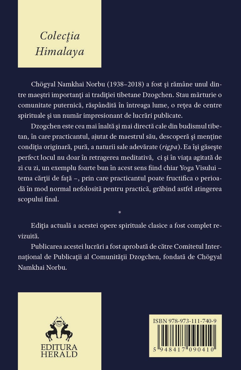 Chögyal Namkhai Norbu (1938–2018) a fost si ramane unul dintre maestri importanti ai traditiei tibetane Dzogchen. Stau marturie o comunitate puternica, raspandita in intreaga lume, o retea de centre spirituale si un numar impresionant de lucrari publicate. Dzogchen este cea mai inalta si mai directa cale din budismul tibetan, in care practicantul, ajutat de maestrul sau, descopera si mentine conditia originara, pura, a naturii sale adevarate (rigpa). Ea isi gaseste perfect locul nu doar in retragerea meditativa, ci si in viata agitata de zi cu zi, un exemplu foarte bun in acest sens fiind chiar Yoga Visului – tema cartii de fata –, prin care practicantul poate fructifica o perioada in mod normal nefolosita pentru practica, grabind astfel atingerea scopului final.