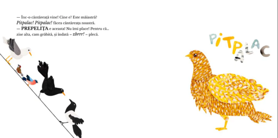 — Uite altă cântăreață! Cine e? Este măiastră? / Ga-ga-ga-ga-ga-ga-ga! făcea cântăreața noastră. — Asta-i GÂSCA! Nu prea-mi place! E-o gâscă sălbatică! / Zise una dintre păsări și îndată – zbrrr! – plecă.