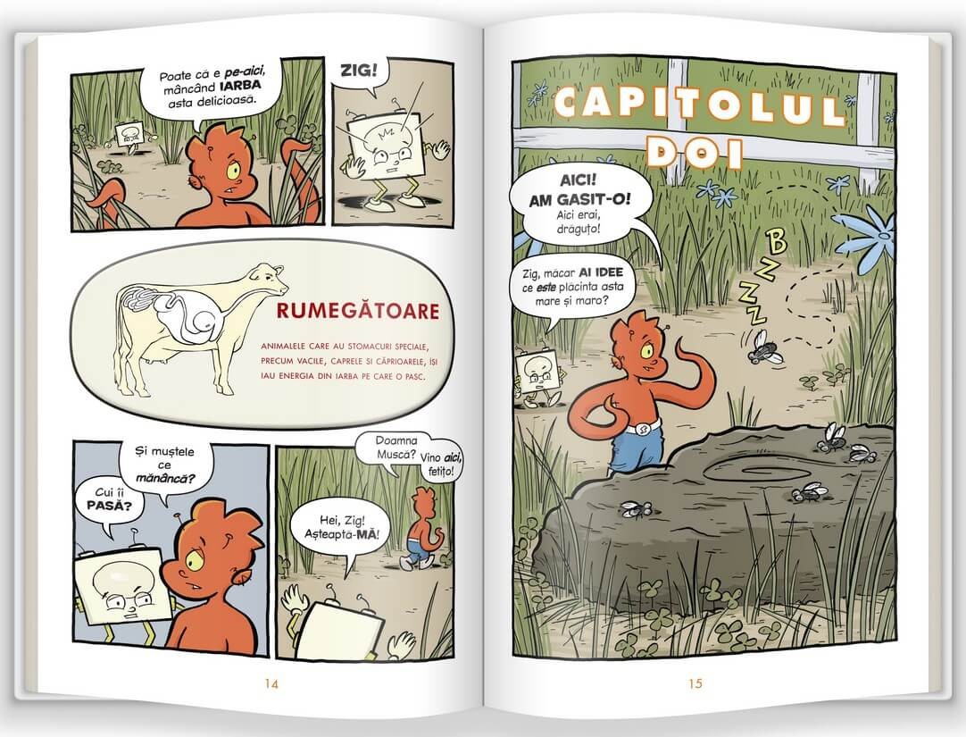 Când prietenii extratereștri Zig și Wikki își pierd nava spațială pe Pământ, prietenia lor este serios pusă la încercare. Pentru a ajunge acasă, ei trebuie să treacă printr-o fermă și printr-o... vacă, aflând pe traseu o mulțime de lucruri interesante despre ecologie (și luându-se la ceartă). Povestea amuzantă, bazată pe informații științifice, a Nadjei Spiegelman și a lui Trade Loeffler e plină de aventuri palpitante și informații despre caca. Ce și-ar putea dori mai mult un tânăr cititor?