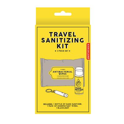 Kit dezinfectant pentru călătorii compus dintr-un recipient cu gel dezinfectant, șervețele atibacteriene și o lanternă.