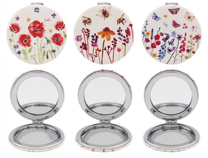 Ușor de luat cu tine, oglinda compactă Flori și Insecte (fluturi și albine) este utilă pentru îngrijirea personală, având o tematică colorată și veselă.