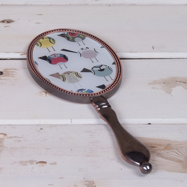 A beautiful hand held mirror. Crafted from bronzed antique style metal and featuring the pattern of Soul Birds on a soft leather effect insert on the reverse. Add a touch of contemporary chic to your dressing table.