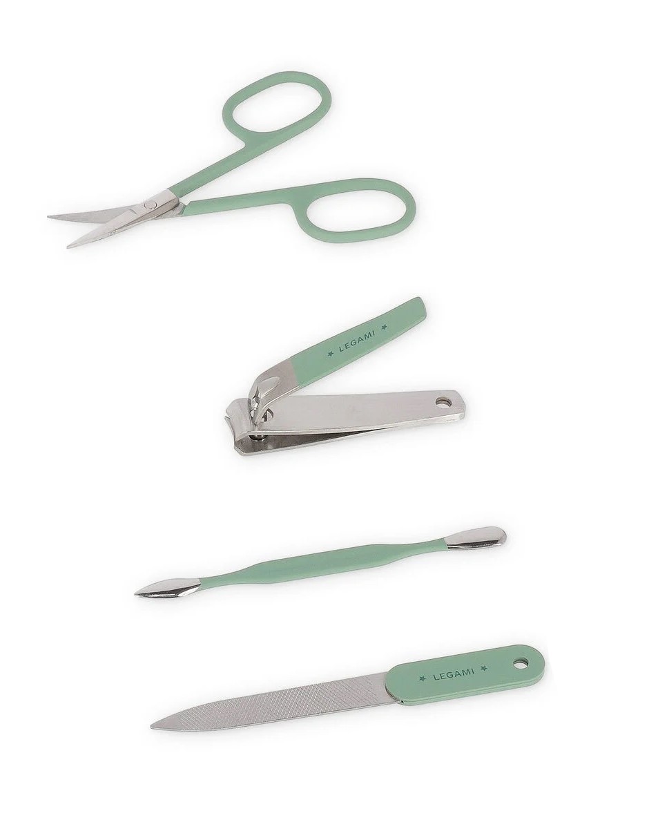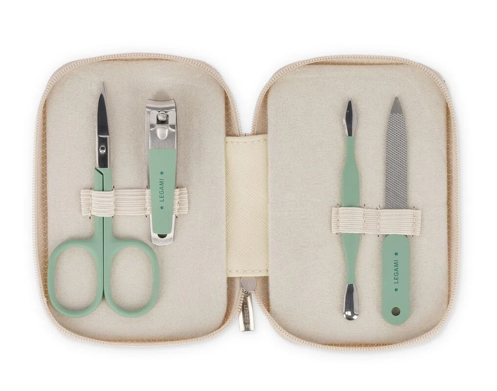 Trusă de manichiură cu foarfecă, unghieră, pilă și dispozitiv de împingere a cuticulelor din oțel inoxidabil.