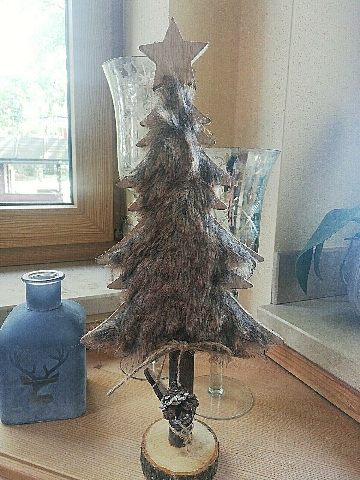 Brăduț pentru Crăciun, fabricat din lemn și ornat cu blană artificială.