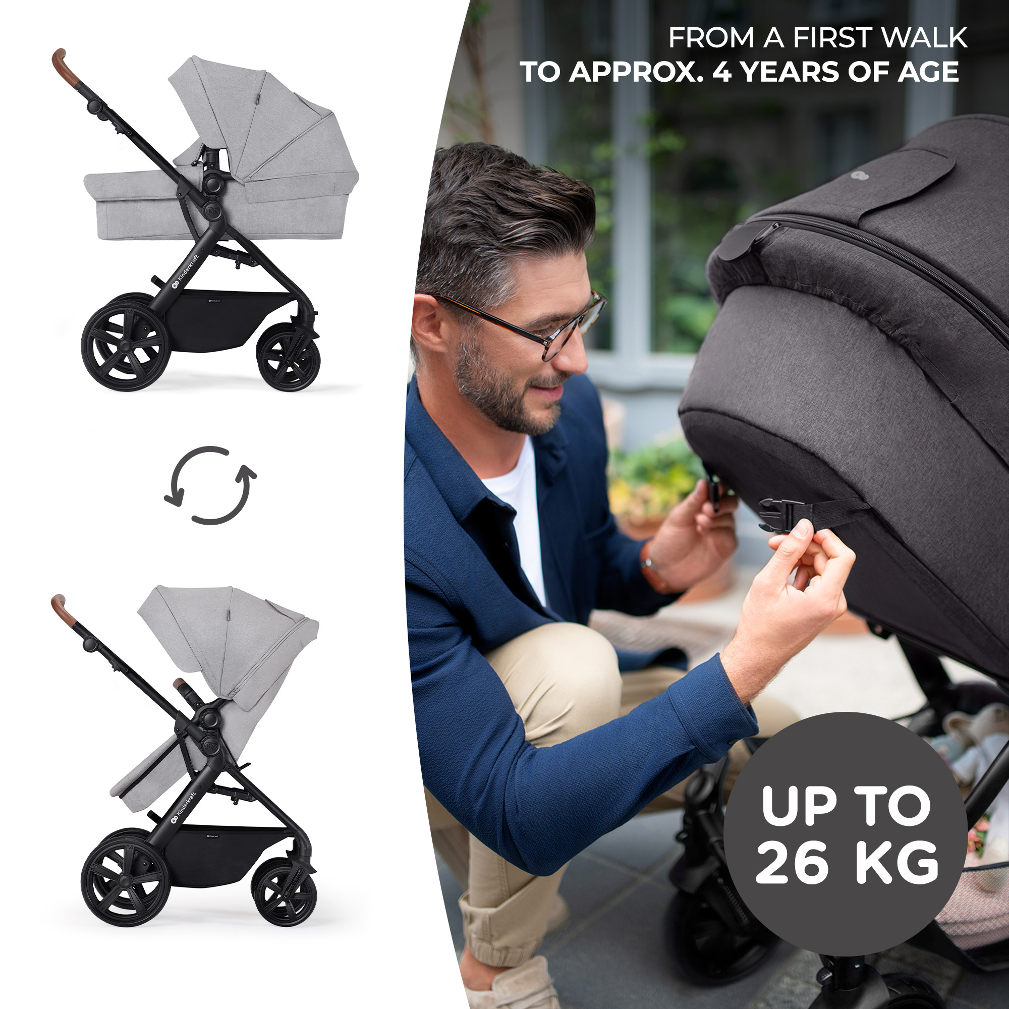 sezutul 2 in 1 A-TOUR LIGHT GREY este un carucior pentru copii de la nastere pana la varsta de 22 kg (aproximativ 4 ani).