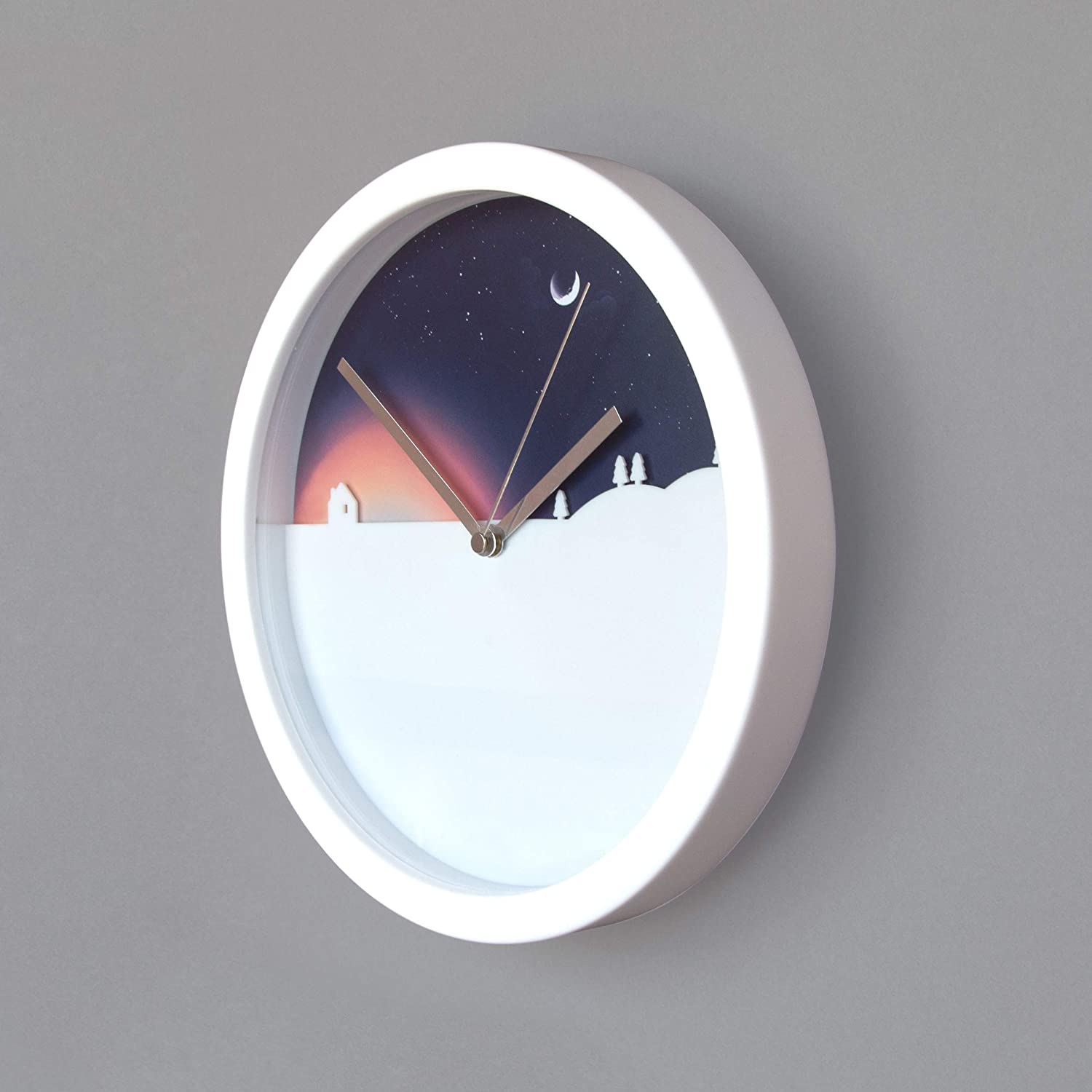 Ceas de perete cu design unic, ce isi schimba infatisarea in functie de momentul zilei, pentru a se potrivi cu peisajul de afara. Un cadou ideal pentru ocazii deosebite. Necesita o baterie AA (nu este inclusa).