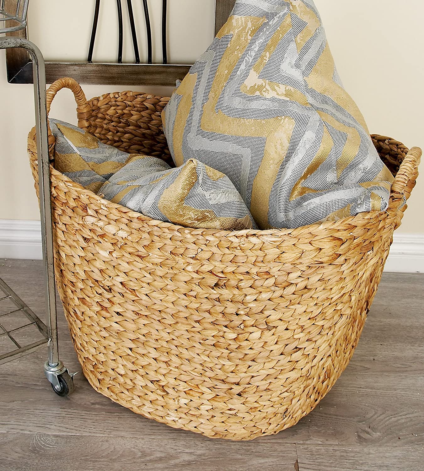 Coș împletit manual, din fibre de zambile de apă (Water Hyacinth), foarte rezistent, cu mânere integrate, pentru a putea fi cărat cu ușurință. Decorativ și practic în același timp, ideal pentru depozitarea hainelor, pernelor, jucăriilor și altor lucruri.