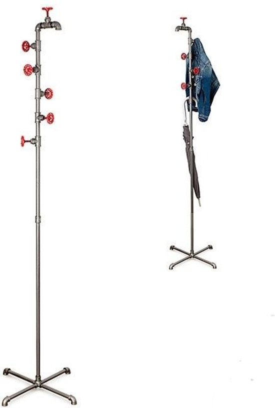 Cuier realizat într-o formă care imită țevile de apă la care s-au asortat și clasicii robineți roșii. Cu siguranță acest cuier atrage privirile oaspeților dumneavoastră.
