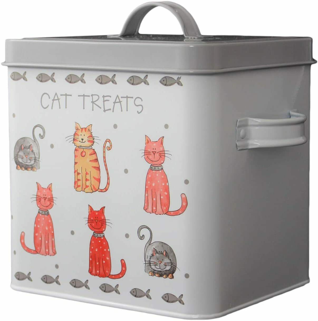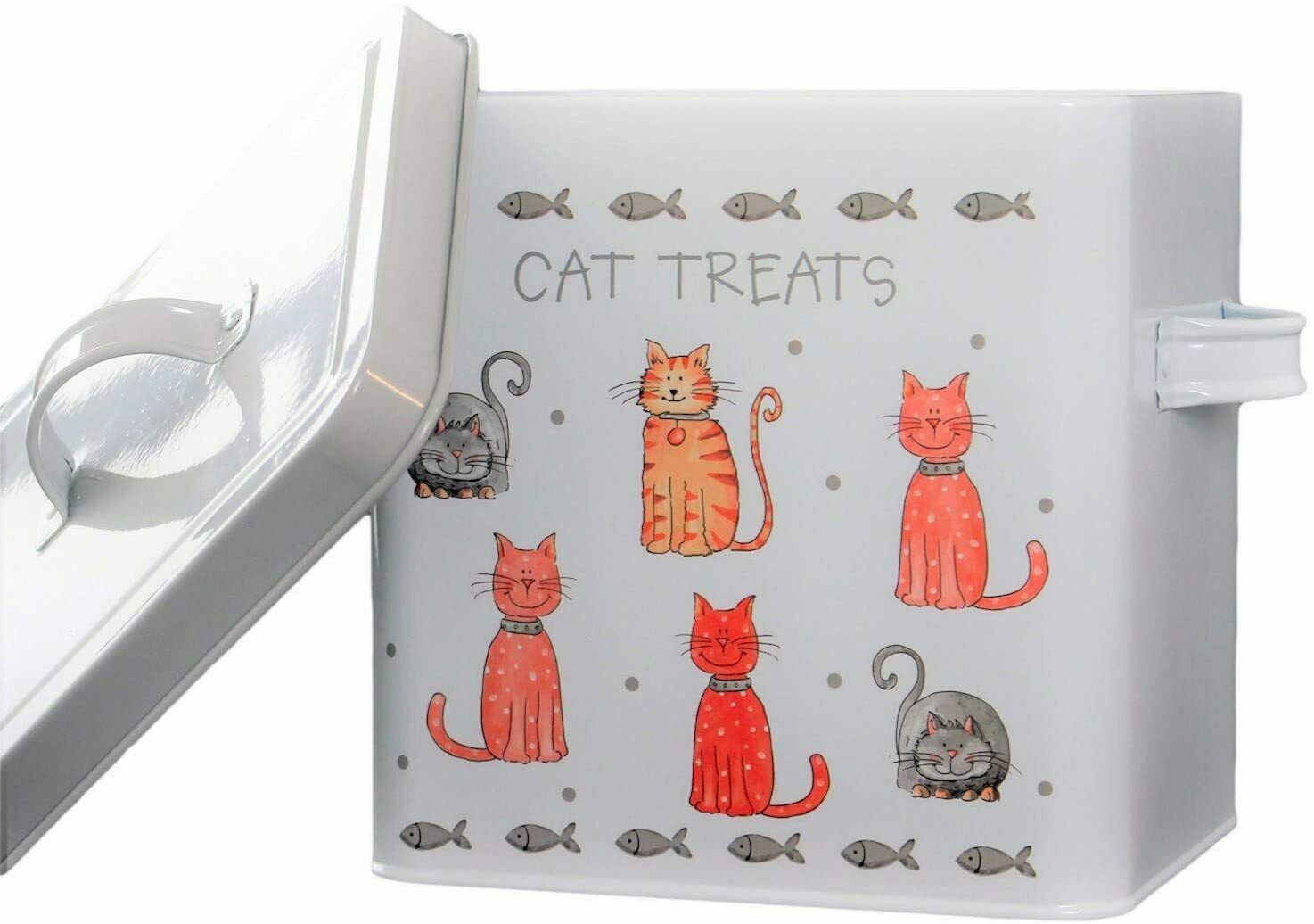 Cutie din metal pentru depozitarea mâncării sau a gustărilor pentru pisici, cu capac ce se închide etanș și mânere. Decorată cu desene ultra simpatice, păstrează crochetele proaspete și este un cadou perfect pentru stăpânii (sau, să fim serioși, servitorii) dragelor animăluțe.