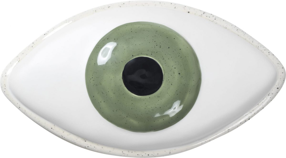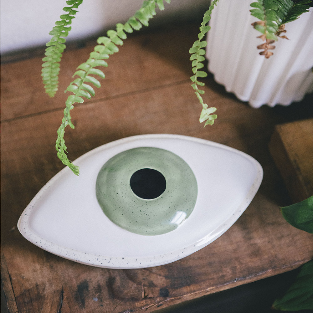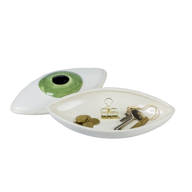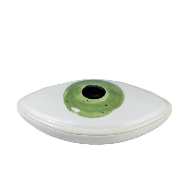 Cutie de depozitare din ceramică cu capac în formă de ochi, perfectă pentru păstrarea diverselor obiecte.