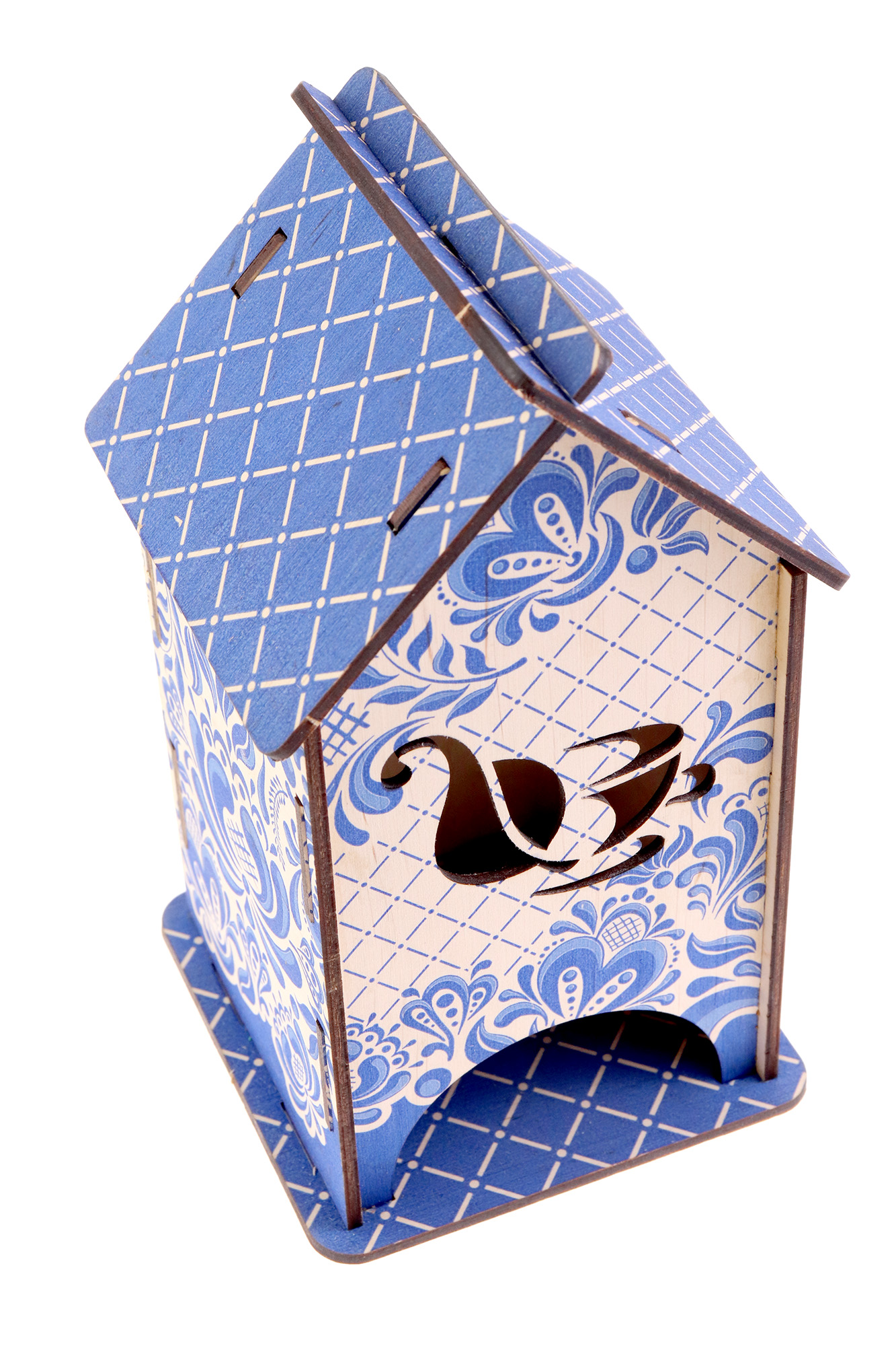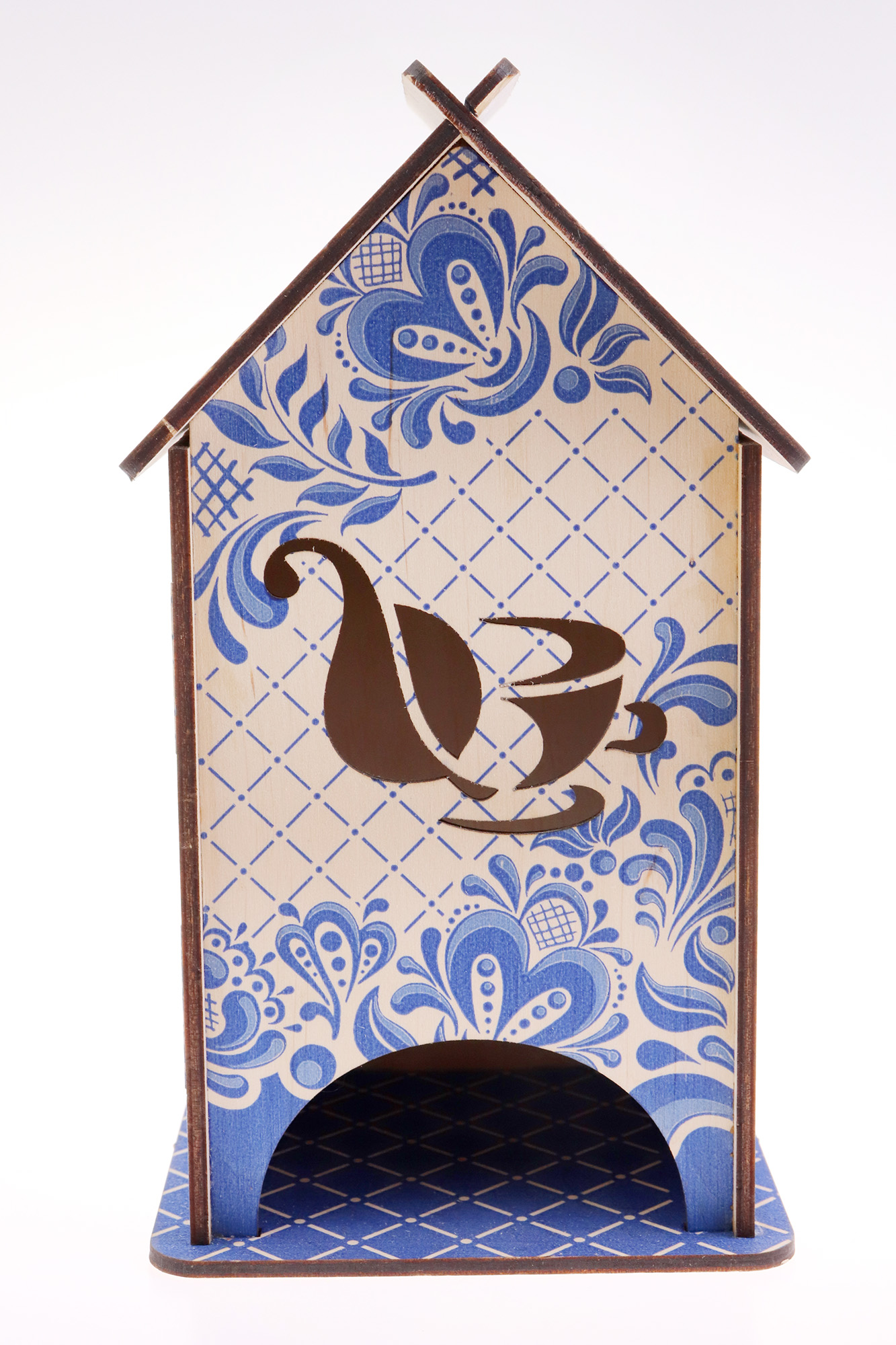 Cutie din placaj, în formă de căsuță, pentru depozitarea pliculețelor de ceai.