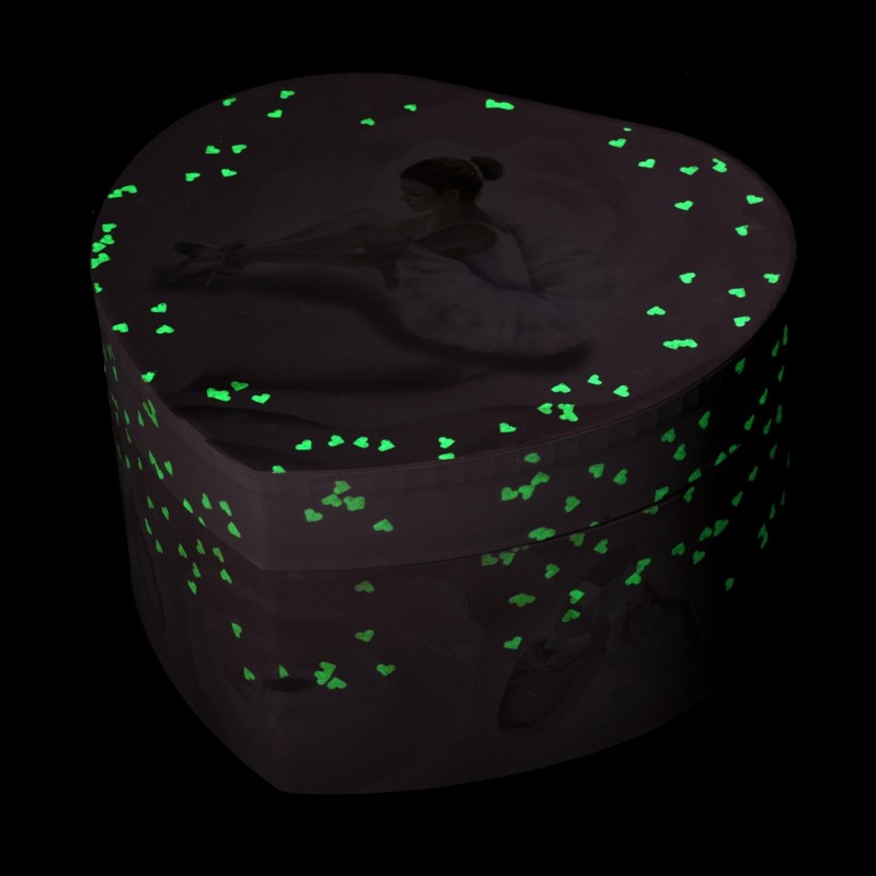 Această cutiuță muzicală este fosforescentă. Dacă este încărcată la lumină artificială sau naturală, strălucește când noaptea se așterne.