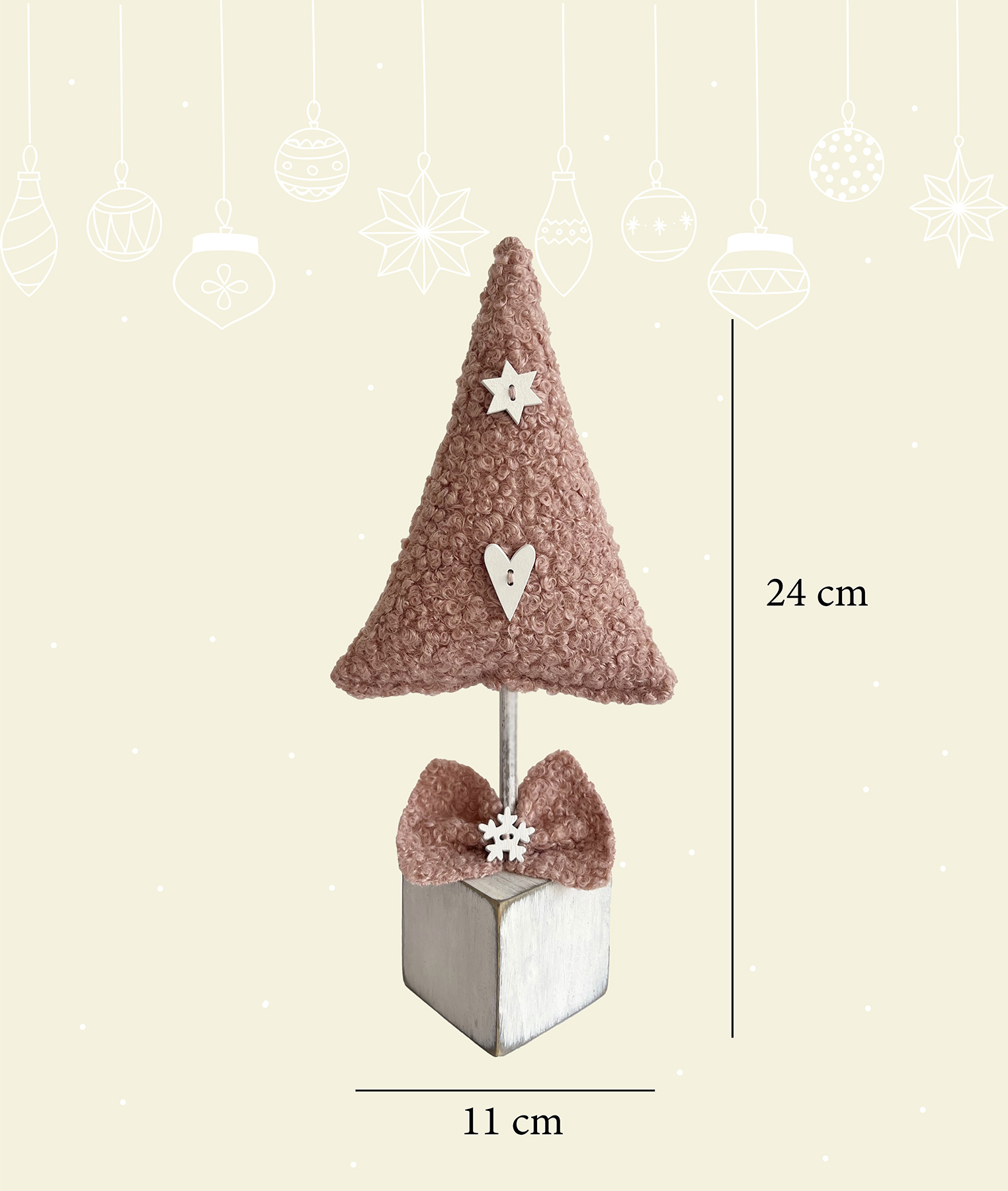 MARGÚ ATELIER creează articole unice handmade. Suntem mândri să vă prezentăm colecția noastră de brăduți de Crăciun, creați cu grijă în fiecare țesătură. Brăduțul textil Handmade JOYFUL PINK reprezintă o alegere perfectă pentru cei care caută un cadou sau o piesă de decor subtilă pentru sărbătorile de iarnă. Realizat cu atenție la detalii, fiecare element contribuie la un aspect autentic. Nasturii, împreună cu suportul din lemn patinat care asigură stabilitatea, adaugă o notă rustică, în timp ce fundița oferă rafinament și eleganță. Este o alegere potrivită pentru cei care apreciază simplitatea și caută autenticitate în decorul sărbătorilor.