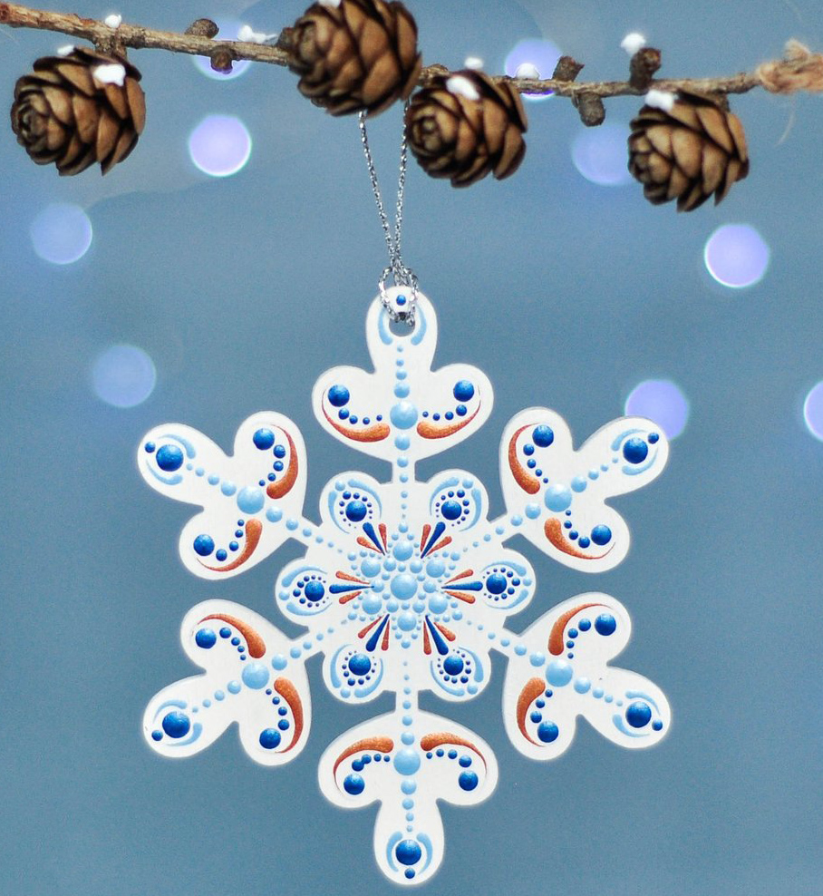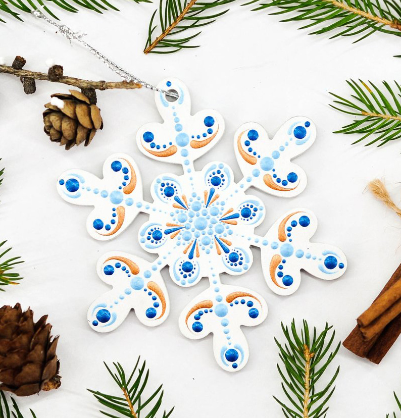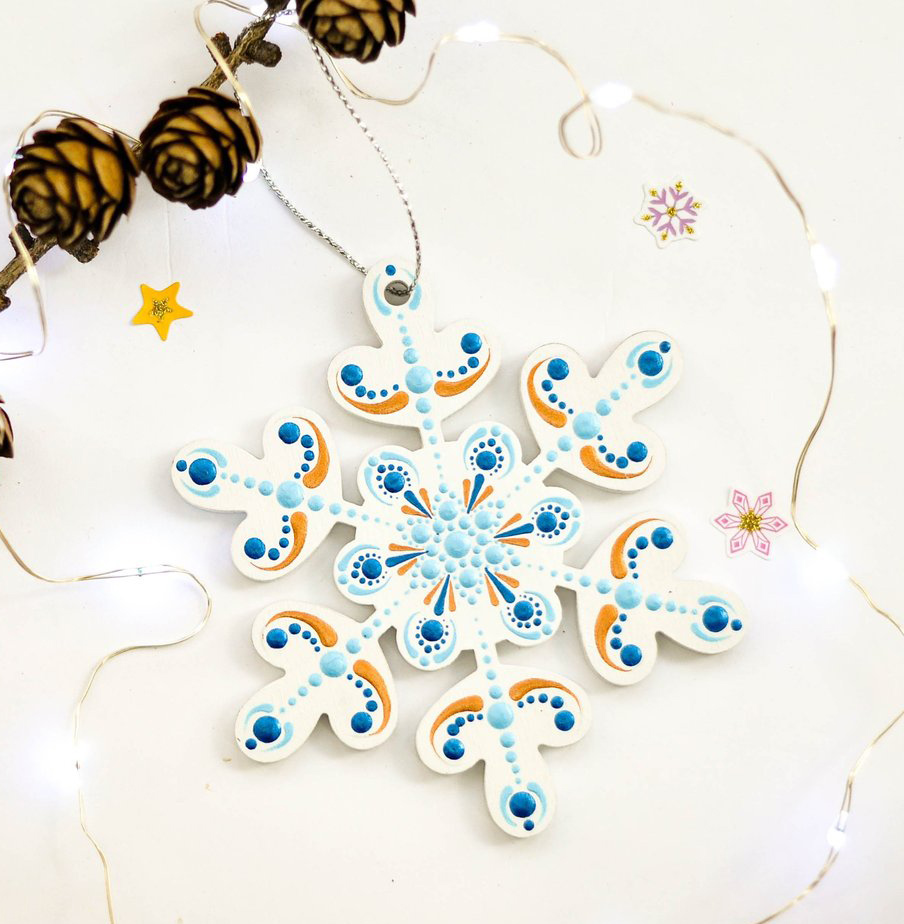 • Fulg de nea din lemn, pictat manual cu culori acrilice pe baza de apa