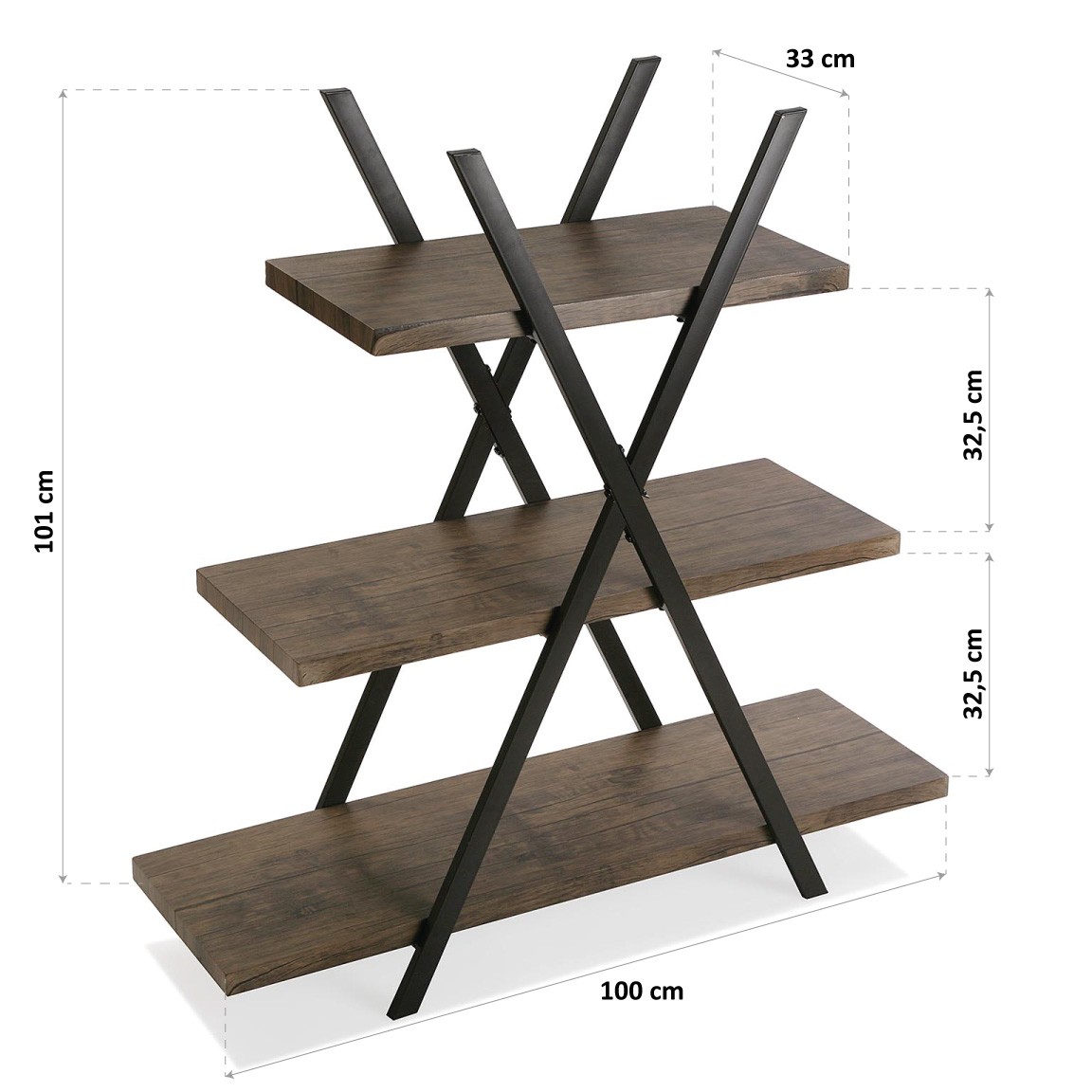 Etajera cu trei rafturi și tuburi metalice de legătură cu dimensiunea: 15 x 30 x 0.8 mm.