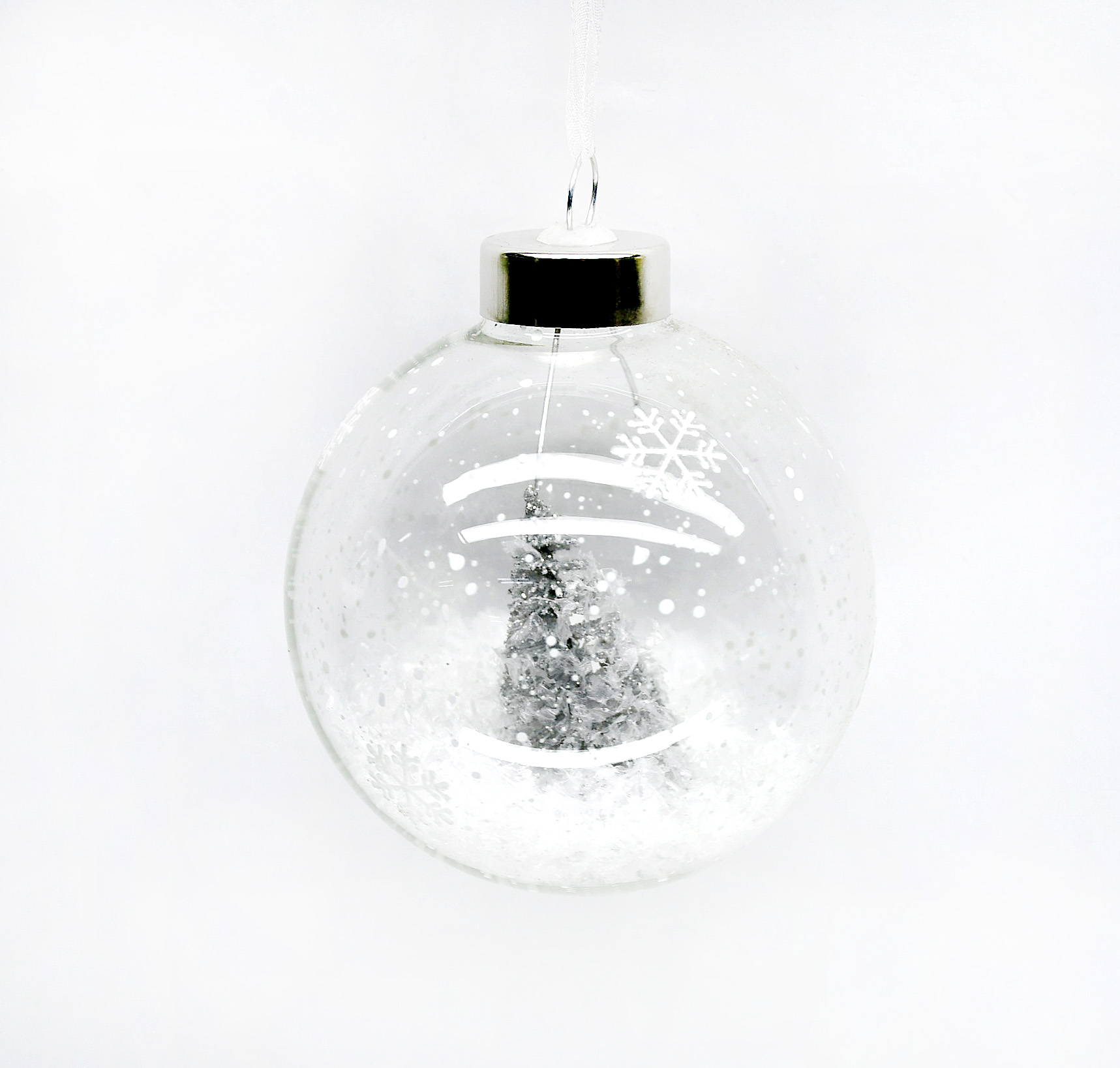Glob din sticlă pentru bradul de Crăciun cu brăduț argintiu la interior, diametru 8 cm.