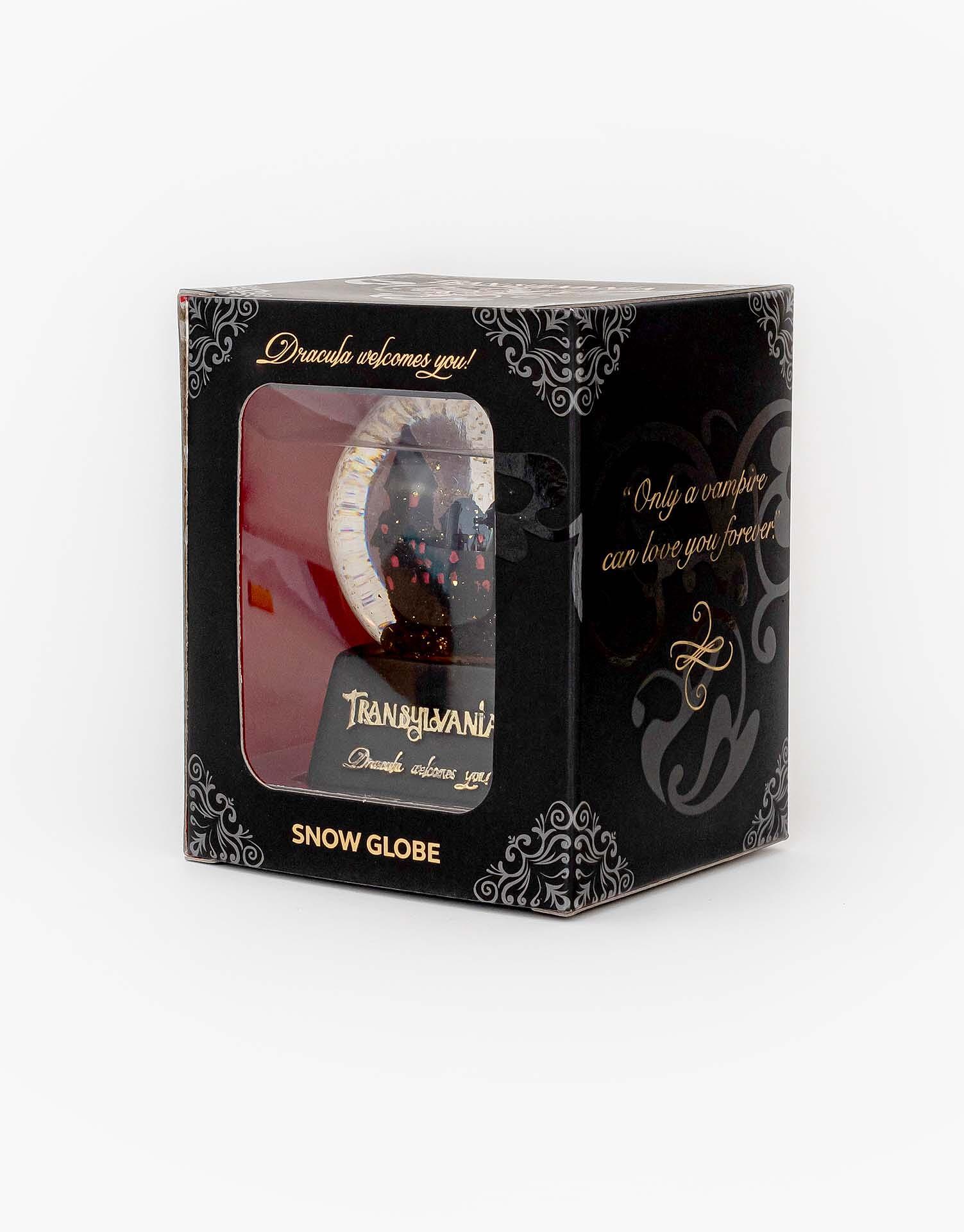 Decorat cu mesajul „Dracula welcomes you!” acesta combina perfect nuantele de negru si auriu pentru a-i oferi o eleganta tipica. In interior, Globul Transylvania, este personalizat cu macheta castelului Bran de culoare neagra, inconjurat de glitter auriu. Pentru un plus de mister acesta este iluminat in interior cu leduri de culoare rosie.