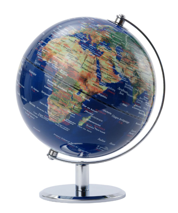 Prezintă o bază metalică cromată, globul pământesc fiind albastru.