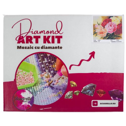 Setul contine: pânza de lucru pusă pe sasiu de lemn, cu imagine tipărită și suprafață adezivă, mărgele tip diamante sortate după culori cu simboluri ce corespund cu locul lor pe imagine,1 tăviță pentru diamante, 1 recipient cu ceară specială, 1 pensetă, 1 stilou special pentru prinderea și plasarea diamantelor.