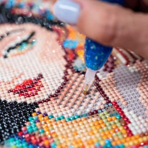 - Deschideți recipientul cu ceară și apăsați cu stiloul în el de câteva ori, apoi prindeți cu stiloul unul din diamantele din tăviță. Acesta se va lipi de vârful stiloului și tot ce trebuie să faceți este să puneți diamantul pe simbolul corespunzător de pe pânza de lucru. Continuați astfel până când tot tabloul este terminat. În cazul în care doriți să întrerupeți temporar activitatea, reatașați folia protectoare pe pânza de lucru, pentru a o proteja tabloul. Dacă ați greșit simbolul, îndepărtați diamantul cu ajutorul pensetei incluse în set.