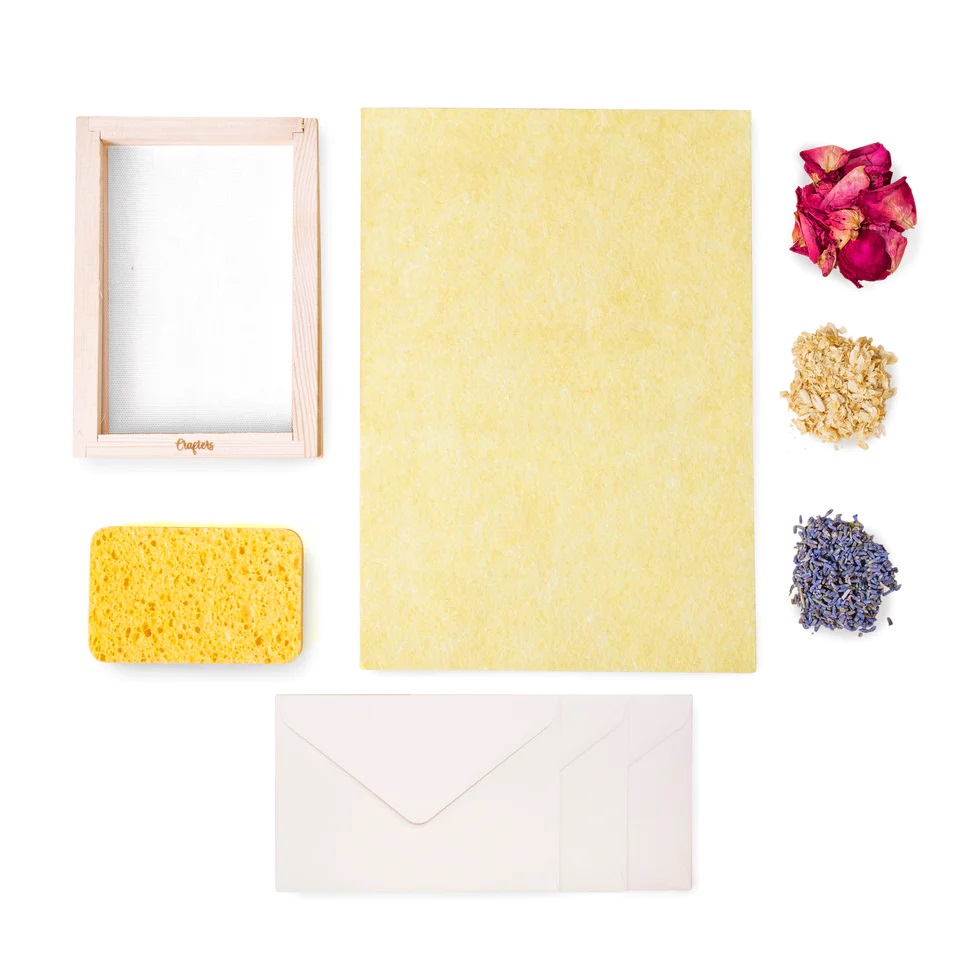 Tot ce ai nevoie pentru a-ți crea propria hârtie manuală cu flori. Include: flori, cadru din lemn, pânză reutilizabilă, burete și 3 plicuri. Design: Hector Serrano. Material: lemn de pin, flori, hârtie, celuloză.