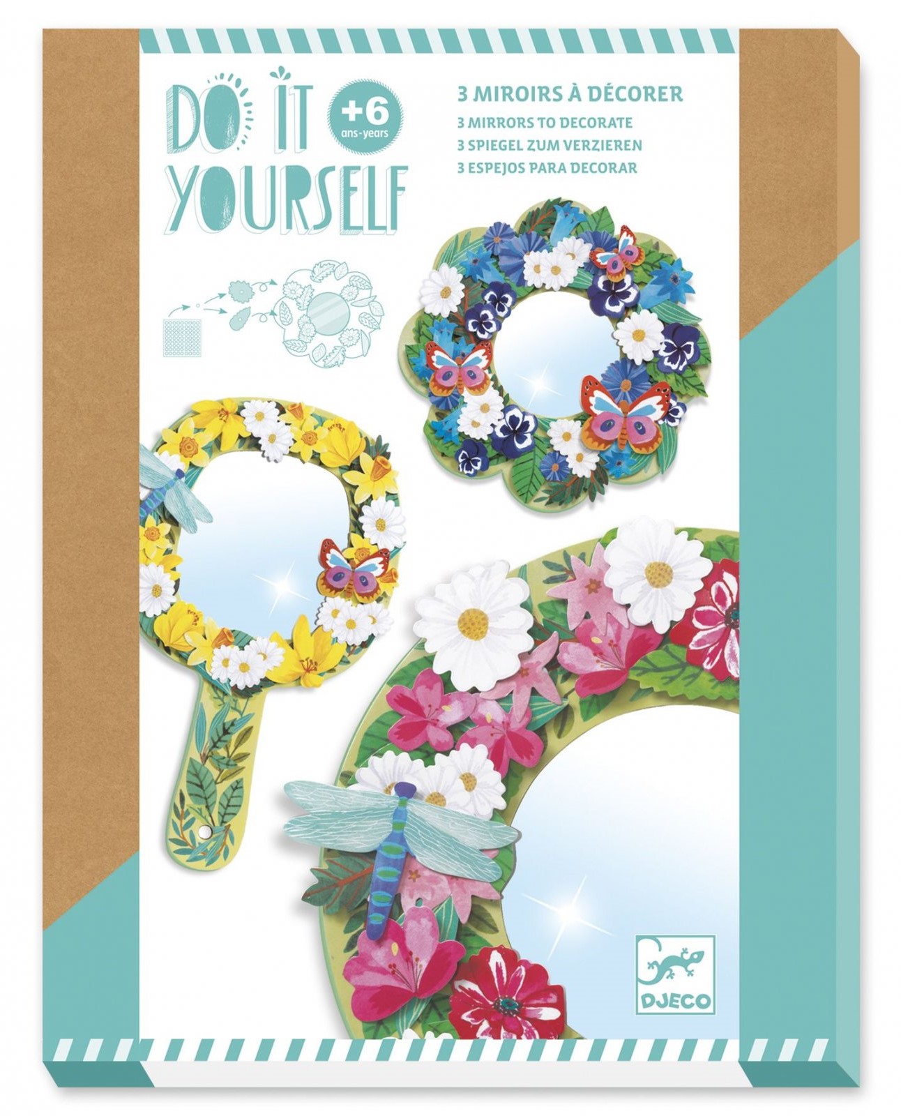 Conținut: 3 oglinzi ilustrate (22 x 12,5 cm, diametru 15 cm, diametru 16 cm), 170 decorațiuni florale din hârtie cretata predecupata, 3 seturi de autocolante groase din spuma față-verso, 3 autocolante speciale pentru agățarea oglinzilor, broșură cu instrucțiuni pas cu pas.