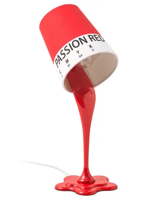 Lampă de birou cu un design inedit, o găletușă din care curge o vopsea de un roșu intens.