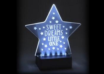 This fun LED star shaped night light glows white when turned on to make little ones feel safer in the dark. The sentimental message 'Sleep Dreams Little One' reassures your little ones to sleep. The light automatically turns off after 2 hours so no need to disturb your little ones sleeping to turn off the night light. The LED bulbs make great lights as they last for 30,000 hours.