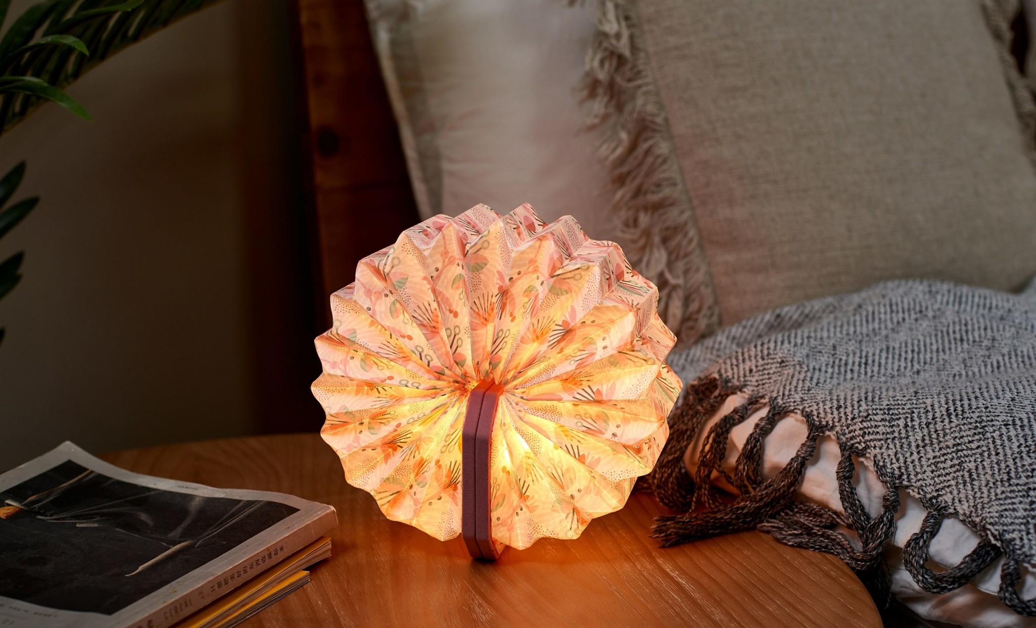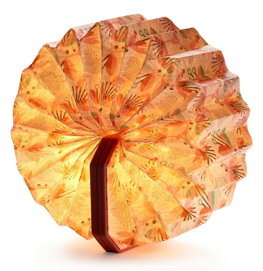Această lampă inspirată de forma unui acordeon poate fi folosită în atât de multe moduri... desfășurați-o și așezați-o pe masă sau conectați capetele magnetice pentru a economisi spațiu și a obține o desfășurare de 360 grade. Puteți de asemenea să o agățați în stilul felinarului chinezesc folosind șnurul magnetic din catifea asortată.