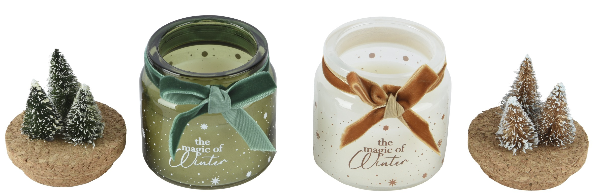 Recipient din sticlă reutilizabil, cu capac decorat cu brăduți.