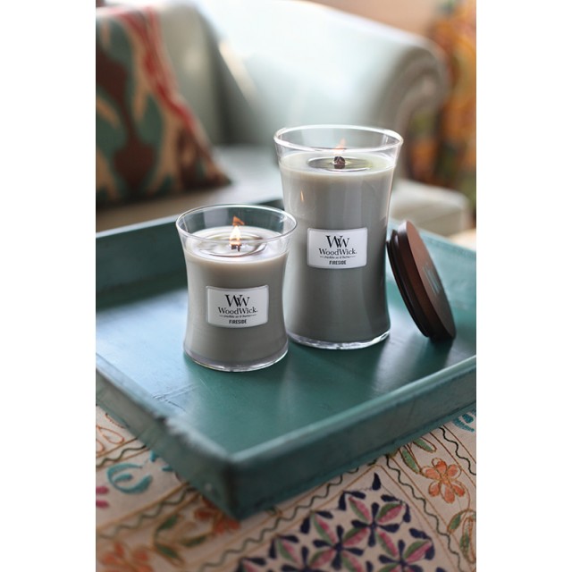 Lumanarile WoodWick® combina sunetul linistitor al unui foc de lemne, cu arome minunate, relaxante, pentru o atmosfera memorabila. Fitilul din lemn natural, prin tehnologia patentata PLUSWICK®, emite in timp ce arde un sunet asemanator lemnelor din semineu si elibereaza in camera parfumul relaxant si imbietor al aromelor WoodWick®.