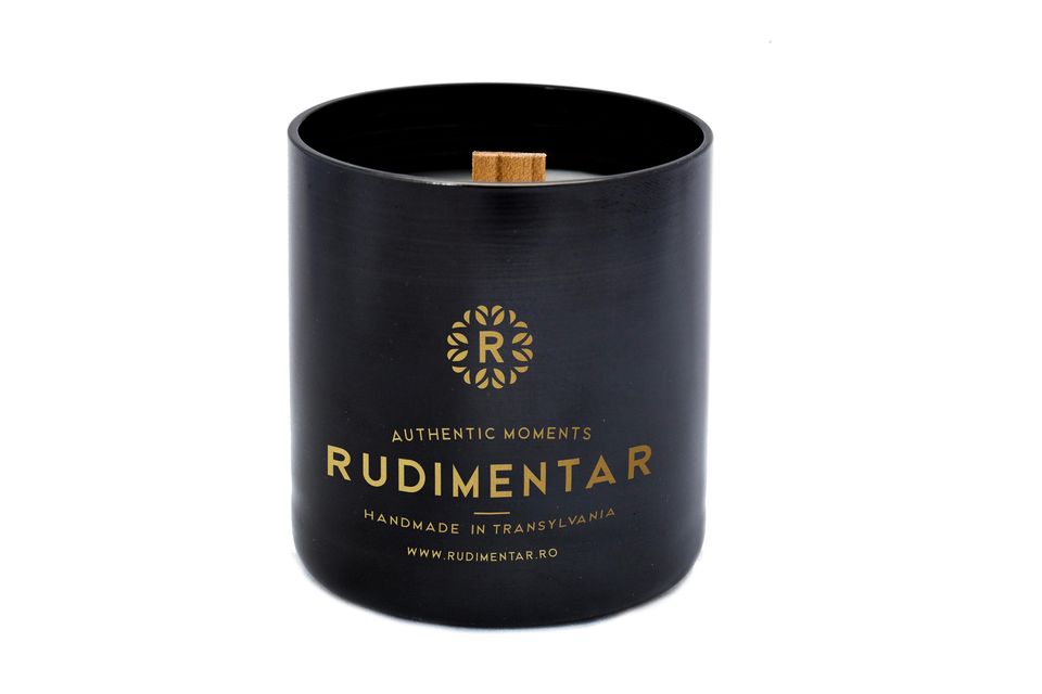 Fitil de lemn de cireș, continut organic, suport de sticla lucrat manual - negru, decalcomanie RUDIMENTAR - parfum - “Dark Honey and Tobacco” , ambalaj carton - maro natur, panglica ripsata cod 131 - FIRE