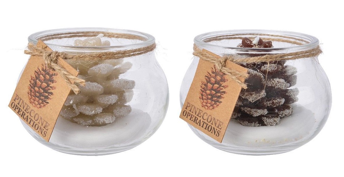 Lumânare în formă de con de pin într-un vas de sticlă.