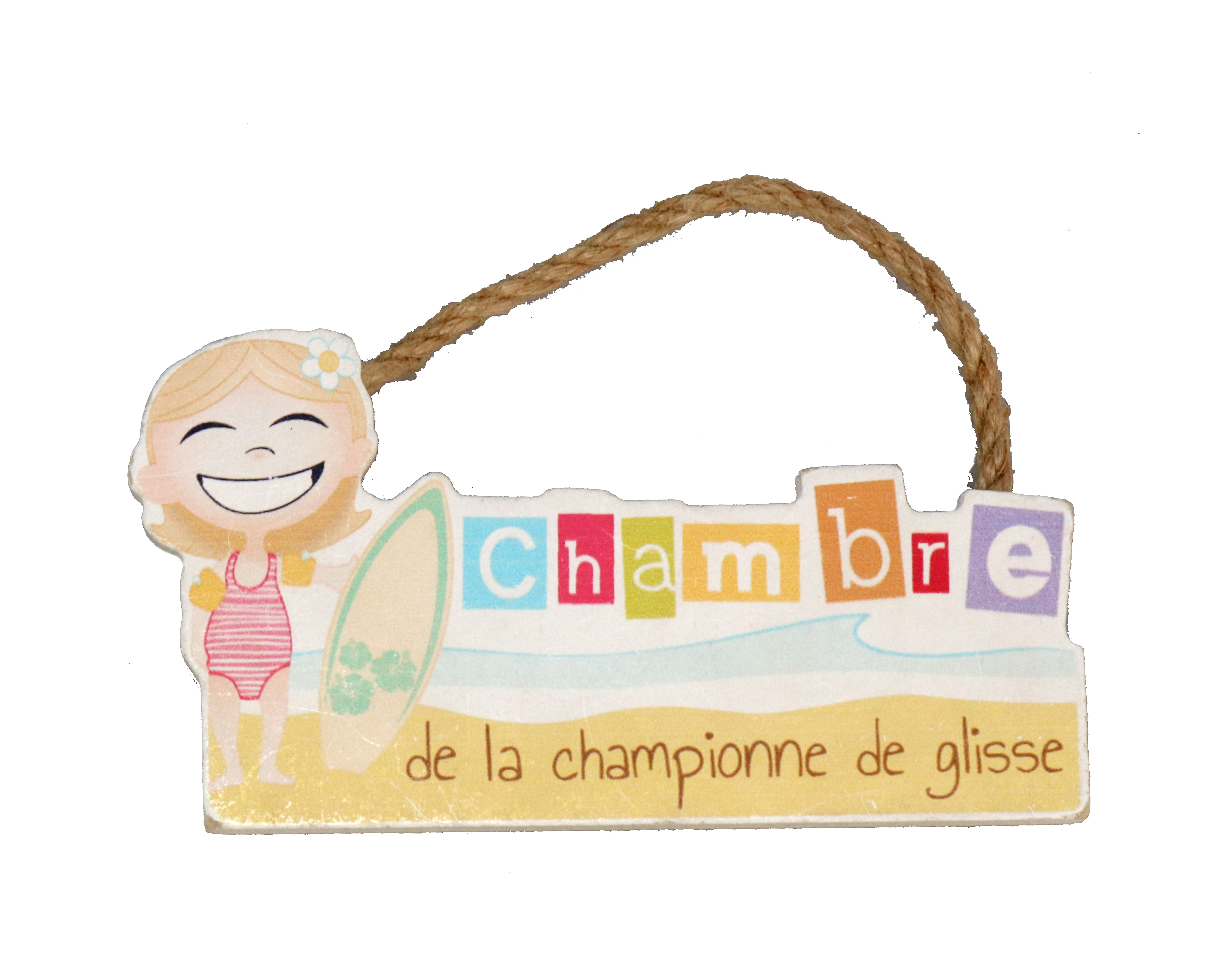 Pancartă amuzantă din lemn purtând mesajul: Chambre de la championne de glisse.