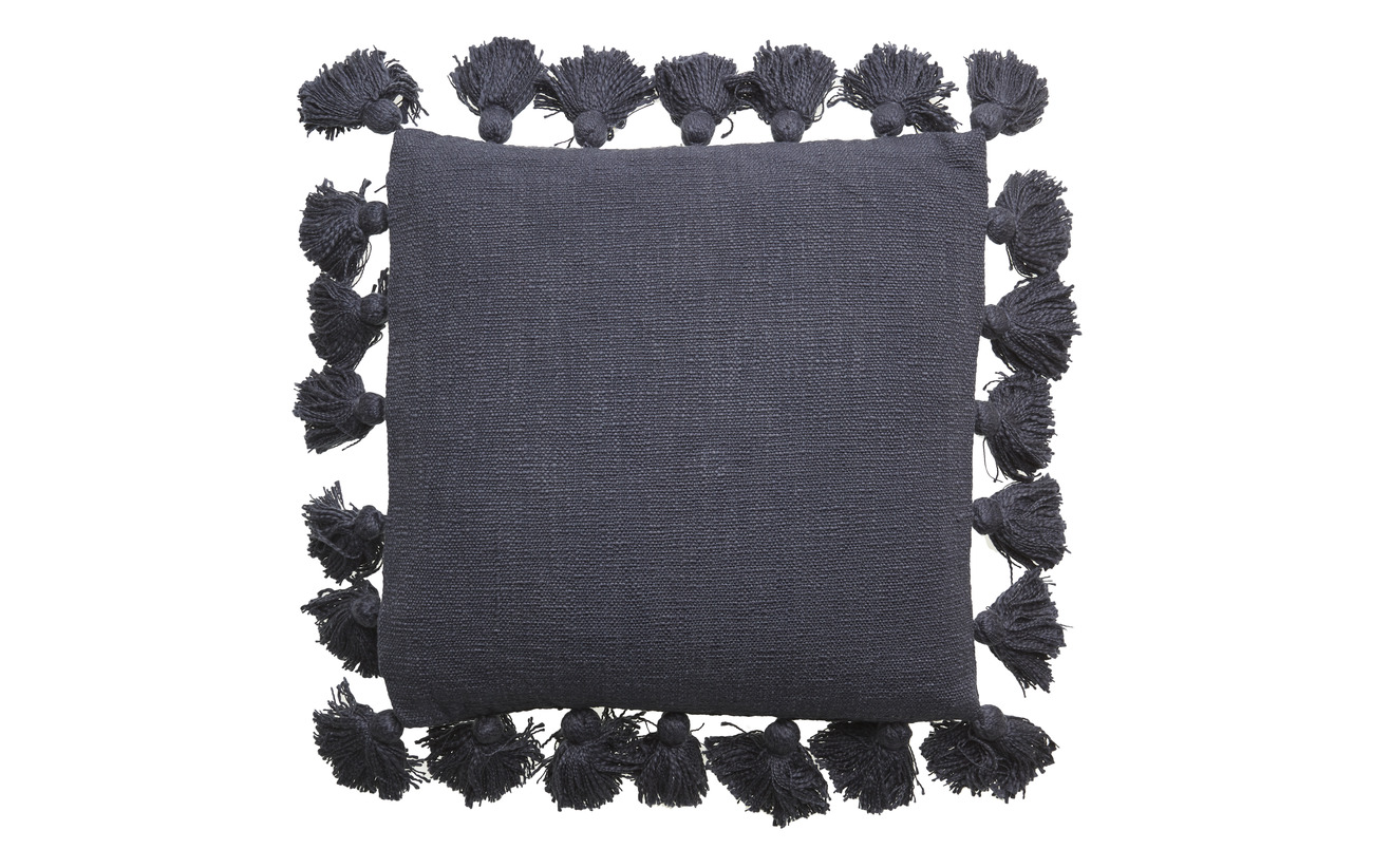 Perna decorativa din bumbac cu ciucuri, realizata intr-o culoare albastru-gri inchis. Modelul esre finisat cu fermoar ascuns si include o perna interioara.
