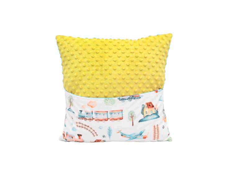 Pernuta cu buzunar pentru carti "Trenulete jucause" este realizata din tesaturi prietenoase cu pielea delicata a celor mici. Folosim bumbac premium, certificat OEKO TEX si "safe for children", combinat cu minky pufos, gros, ce isi pastreaza forma si calitatile timp indelungat.
