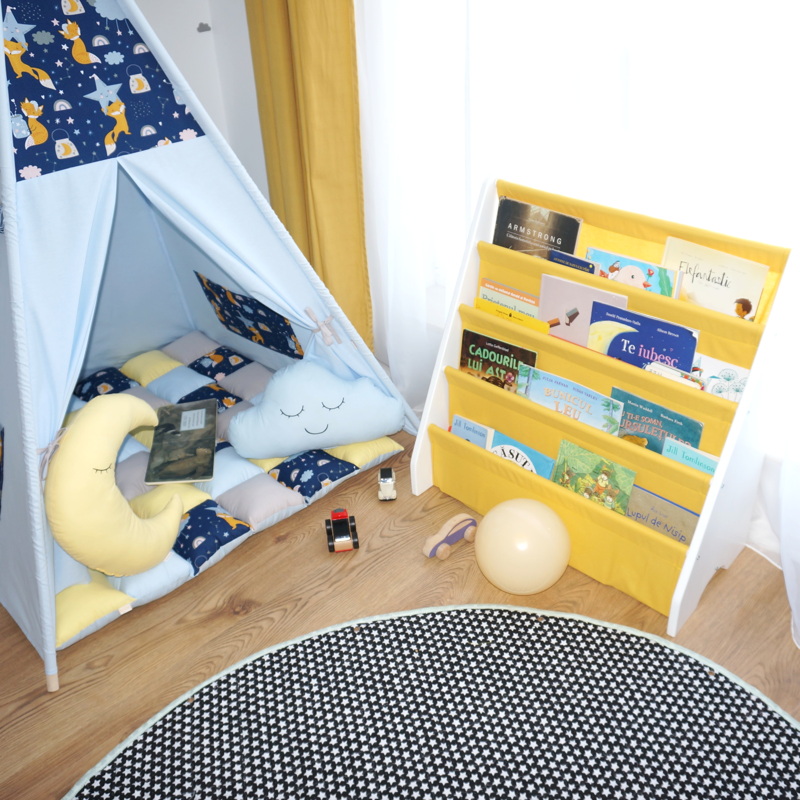 Husa textila a raftului pentru carti este cusuta din pasiune, cu atentie la detalii. Avem grija in alegerea furnizorilor nostri precum si ca mediul de lucru din atelier sa fie unul adecvat confectionarii produselor destinate copiilor.