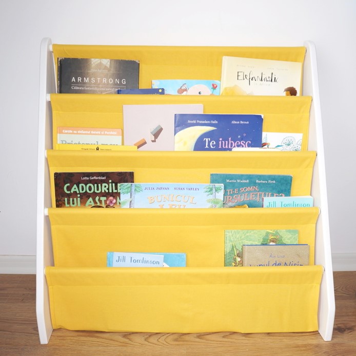 Raftul pentru carti de culoare galbena, este potrivit atat pentru fete cat si pentru baieti. Fiind confectionat din lemn masiv si din bumbac 100%, poate fi folosit pe termen lung. Carti mari, carti mici, carti subtiri sau carti groase, toate isi gasesc locul in cele 4 spatii de depozitare.