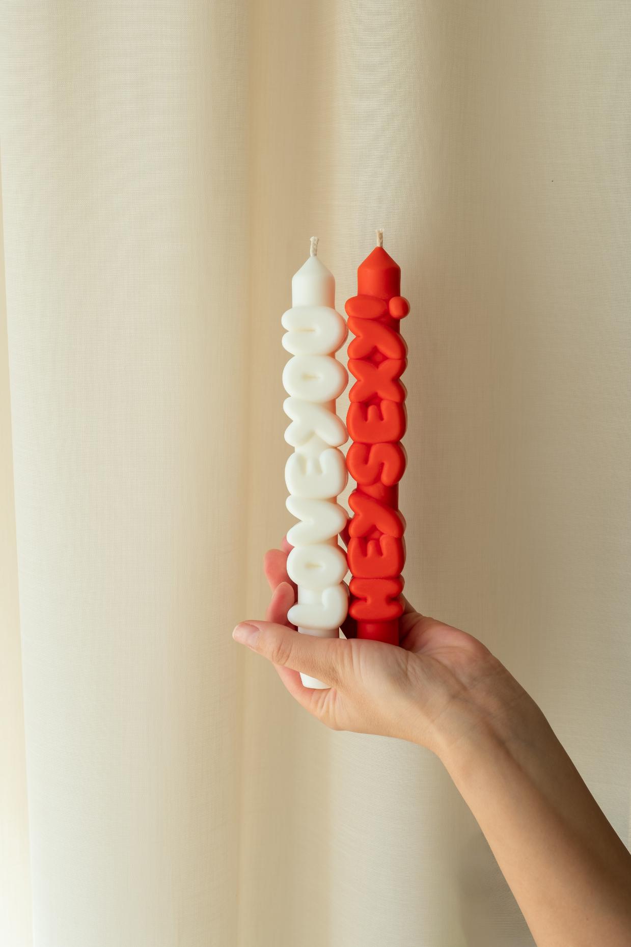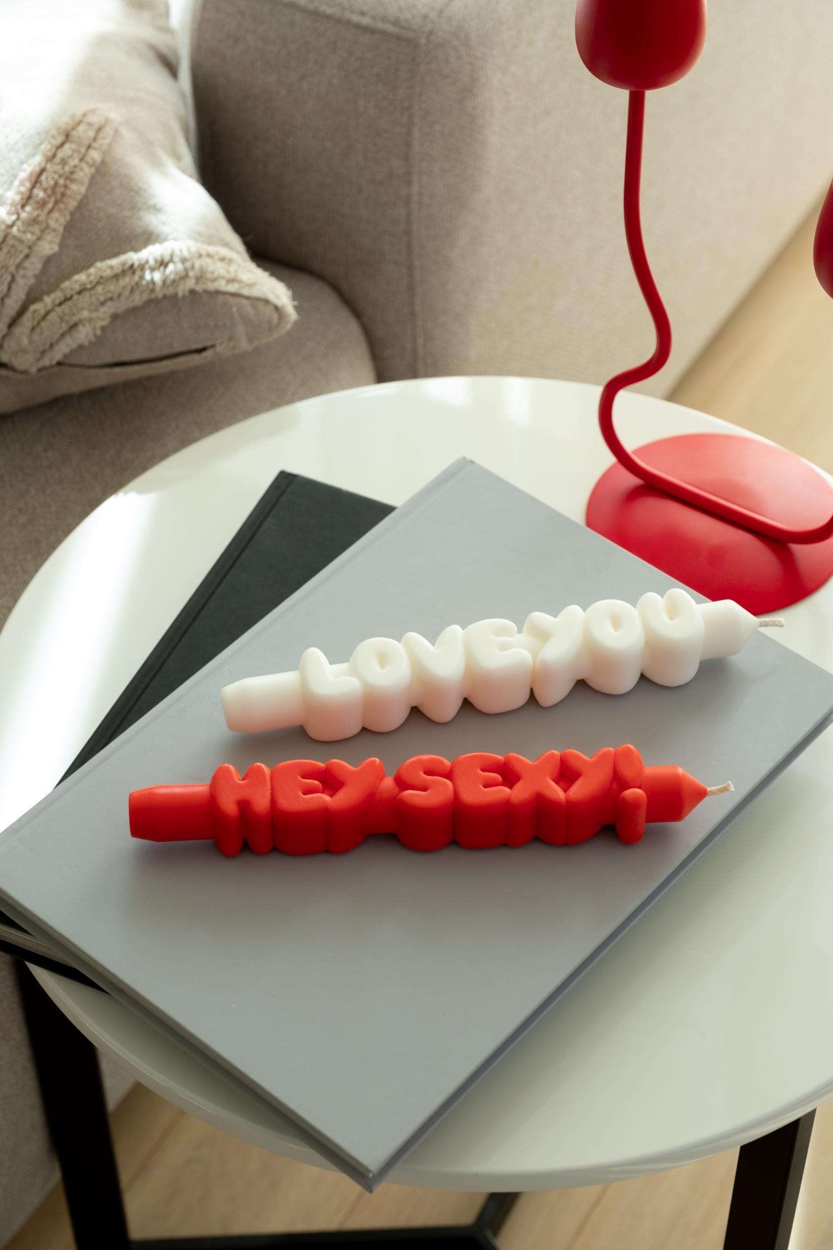 Arde sau oferă cadou un set de 2 lumânări 3D Taper cu mesaje diferite: Hey Sexy! & Love You.