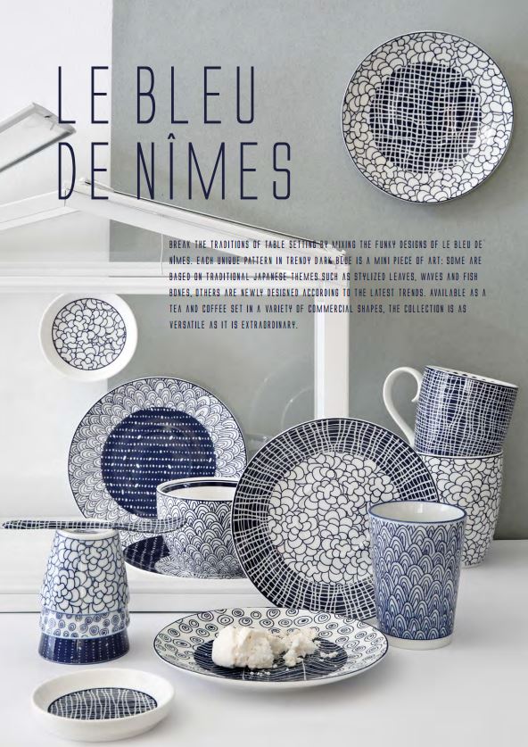 Mix and match bolurile si farfuriile din colectia Bleu de Nimes. Imprimeurile desenate in portelan albastru sunt inspirate din tematici traditionale Japoneze.