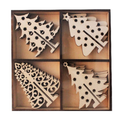 Decoratiuni din lemn cu grosimea de 3 mm, dimensiunea aproximativa a decoratiunilor este 7 cm, dimensiunea cutiei: 20x20x2.5 cm.