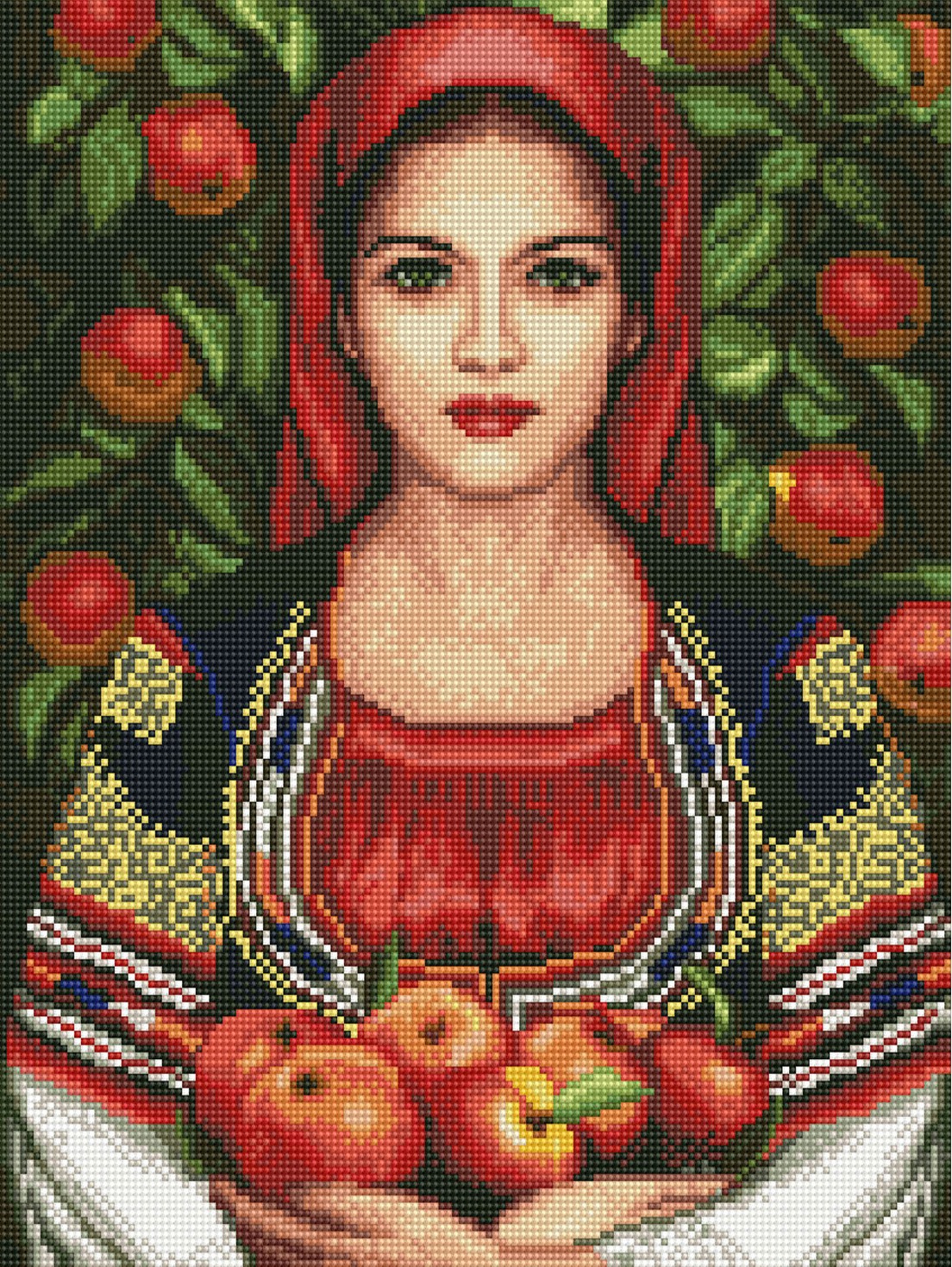 Setul contine: pânza de lucru pusă pe sasiu de lemn, cu imagine tipărită și suprafață adezivă, mărgele tip diamante sortate după culori cu simboluri ce corespund cu locul lor pe imagine,1 tăviță pentru diamante, 1 recipient cu ceară specială, 1 pensetă, 1 stilou special pentru prinderea și plasarea diamantelor.