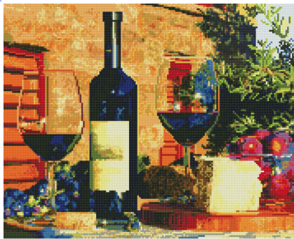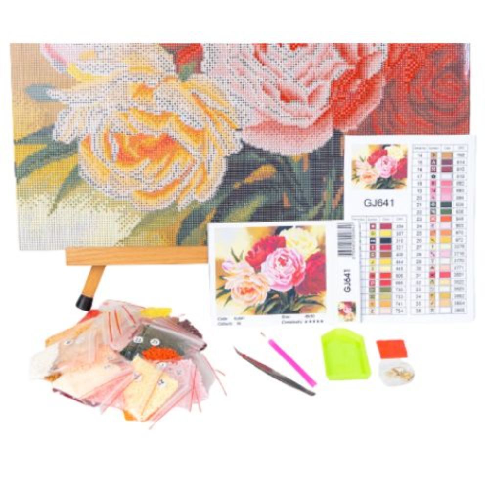 Setul contine: pânza de lucru pusă pe sasiu de lemn, cu imagine tipărită și suprafață adezivă, mărgele tip diamante sortate după culori cu simboluri ce corespund cu locul lor pe imagine,1 tăviță pentru diamante, 1 recipient cu ceară specială, 1 pensetă, 1 stilou special pentru prinderea și plasarea diamantelor.