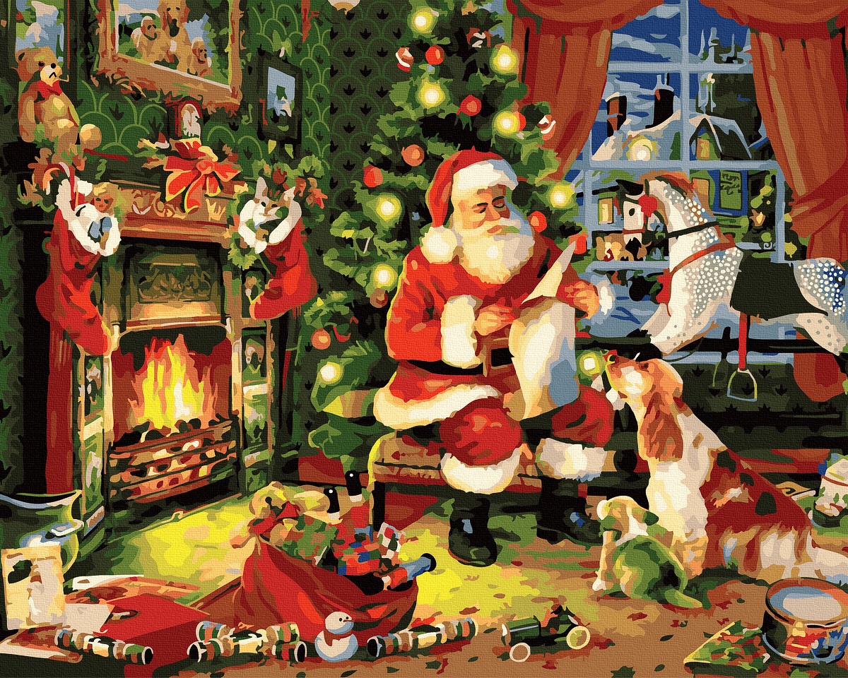Pictură pe numere – Mos Craciun la semineu este un tablou de complexitate medie și poate fi pus după finalizare pe peretele locuinței tale.