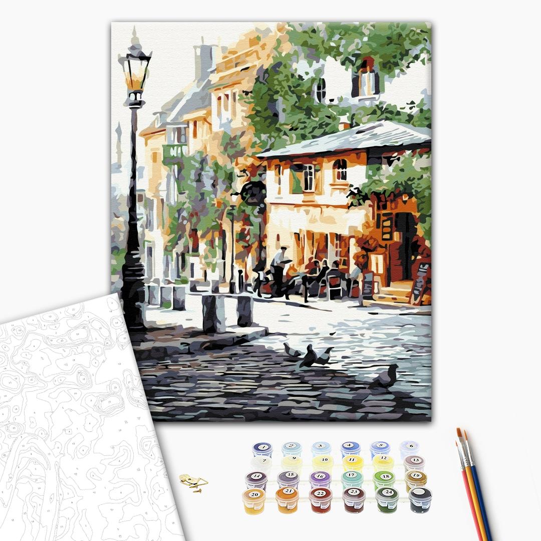Pachetul contine: panza din bumbac intinsa pe sasiu din lemn, setul de culori acrilice numerotate, pensule de diferite marimi, agatatoare de perete.
