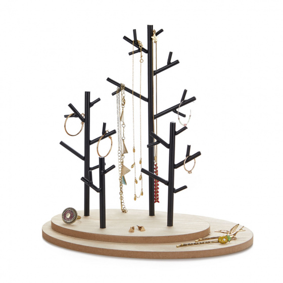 Suport pentru bijuterii cu o bază din lemn și ramuri din metal.