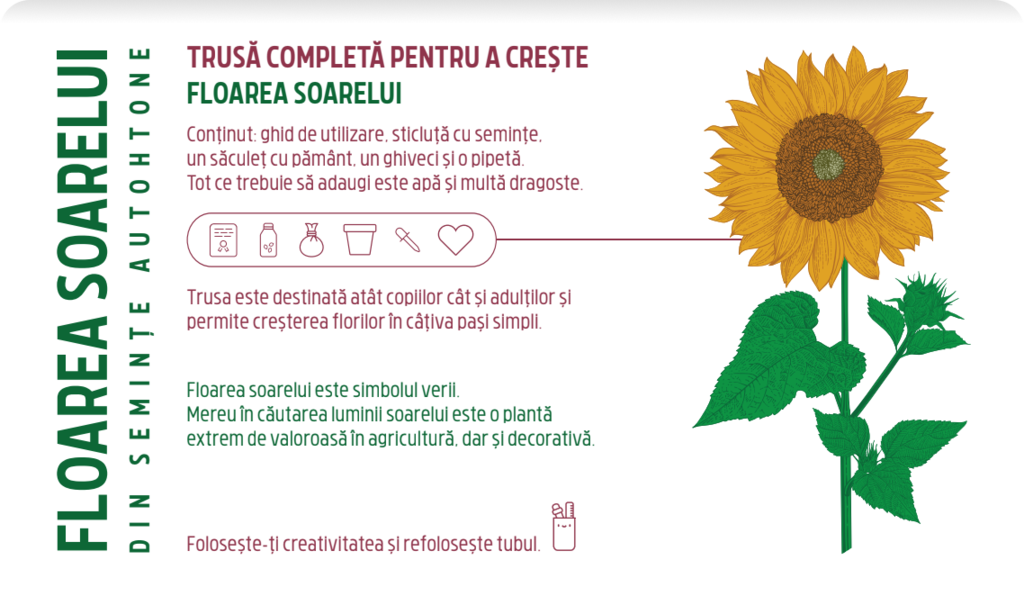In tubul cilindric se regasesc toate ustensilele, care te vor ajuta sa ai o ”soreanca”. Trusa poate fi un cadou deosebit, un proiect educativ, dar si unul distractiv, prin care natura ajunge ”la pachet” acasa sau la birou.