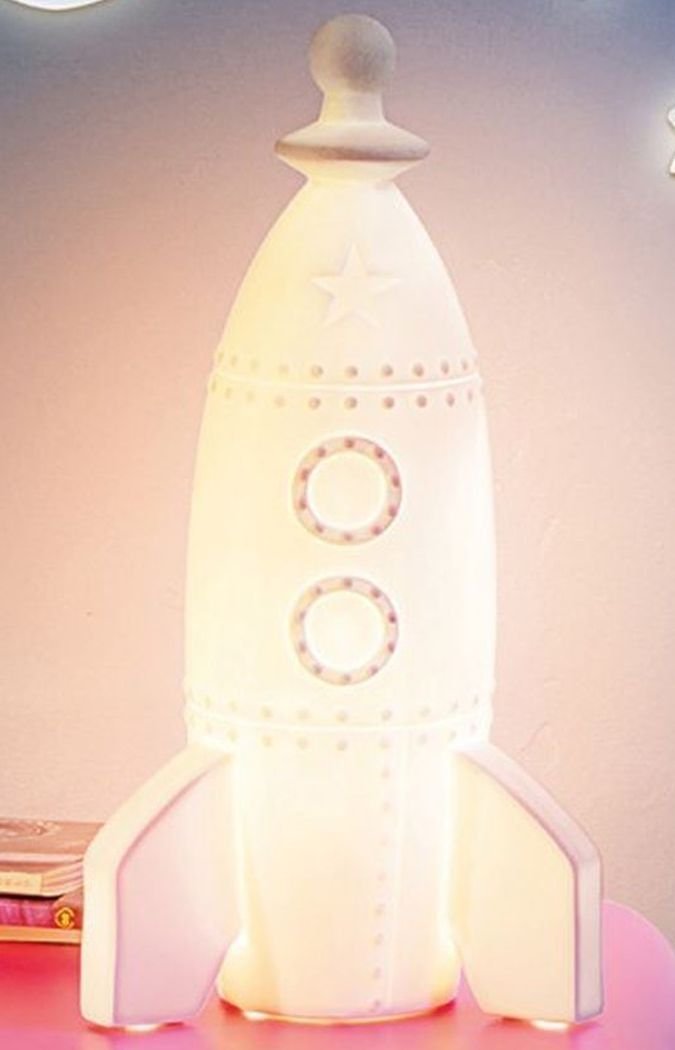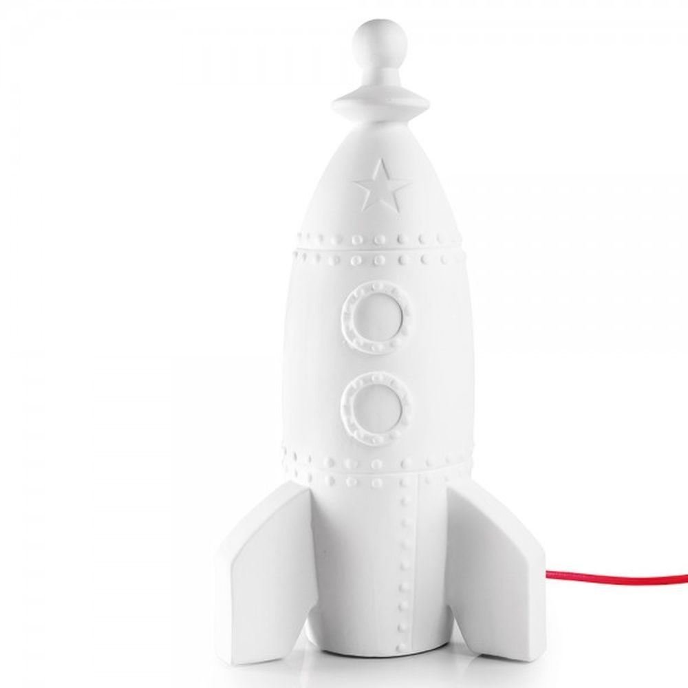 Veioza alba din portelan. forma de racheta, tresa cablu poliester (0.5 m).